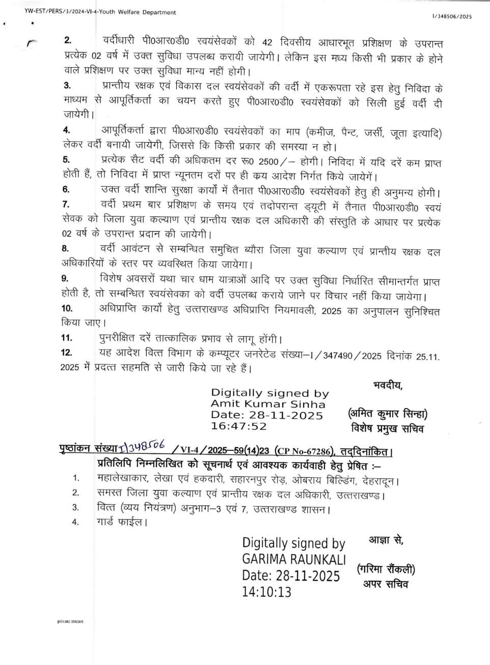 देहरादून :- प्रान्तीय रक्षक एवं विकास दल (पीआरडी) स्वयंसेवकों के लिए वर्दी भत्ते में वृद्धि की गयी है। अब वर्दी भत्ते के लिए हर 2 साल में ₹1500 के बजाय ₹2500 दिए जाएंगे। सर्दी और गर्मी के अलग-अलग यूनिफॉर्म सेट भी तय कर दिए गए हैं।