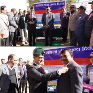 देहरादून/चम्पावत :- अपने चम्पावत दौरे के दौरान उत्तराखण्ड शासन के मुख्य सचिव आनन्द बर्द्धन ने जिला सभागार परिसर में भूतपूर्व सैनिकों से भेंट कर सशस्त्र सेना झंडा दिवस (Armed Forces Flag Day) के प्रति सम्मान प्रकट किया। मुख्य सचिव ने वीर सैनिकों के योगदान को नमन करते हुए फ्लैग लगाया।