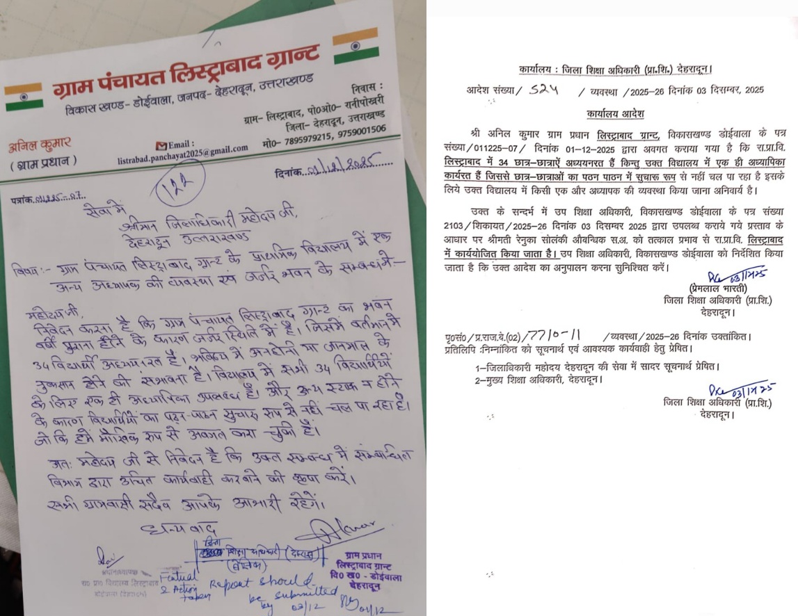 देहरादून :- जिलाधिकारी सविन बंसल के संज्ञान में आते ही 24 घंटे के भीतर रा.प्रा.वि. लिस्ट्राबाद में शिक्षिका की तैनाती कर दी गई है। इसके बाबत जिला शिक्षा अधिकारी ने शिक्षिका के तैनाती के आदेश जारी कर दिए हैं।