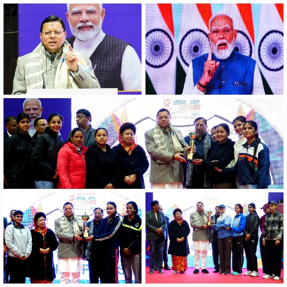 देहरादून :- मुख्यमंत्री पुष्कर सिंह धामी ने गुरूवार को तिब्बती मार्केट, देहरादून स्थित ओल्ड मल्टीपरपज हॉल में सासंद खेल महोत्सव-2025 के समापन समारोह कार्यक्रम में प्रतिभाग किया। इस अवसर पर उन्होंने विभिन्न खेल स्पर्धाओं में विजेता टीम को सम्मानित भी किया।