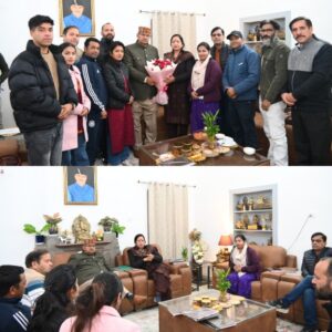 देहरादून :- कैबिनेट मंत्री गणेश जोशी से आज उनके कैंप कार्यालय में नगर पालिका अध्यक्ष मीरा सकलानी ने शिष्टाचार भेंट की। इस दौरान नगर पालिका अध्यक्ष ने मसूरी क्षेत्र में जनहित एवं आमजन की सुविधाओं से जुड़े विभिन्न विकास एवं सुरक्षा संबंधी कार्यों के निष्पादन को लेकर एक ज्ञापन कैबिनेट मंत्री को सौंपा। इस दौरान कैबिनेट मंत्री गणेश जोशी ने सभी को नव वर्ष की बधाई एवं शुभकामनाएं भी दी।