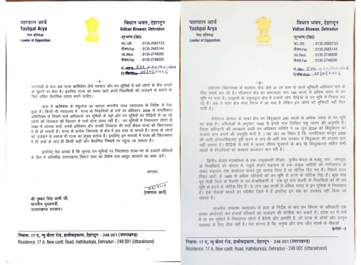 देहरादून :- 5 जनवरी 2026 को नेता प्रतिपक्ष यशपाल आर्य ने मुख्यमंत्री को पत्र लिखकर कहा 22 दिसंबर 2025 को ऋषिकेश के पशु लोक और उससे लगे इलाकों की 2866 एकड़ भूमि के मामले में माननीय उच्चतम न्यायालय के कठोर निर्देश आए है। माननीय न्यायालय ने मुख्य सचिव उत्तराखण्ड व मुख्य वन संरक्षक उत्तराखण्ड को इस प्रश्नगत भूमि की जांच करने के लिए एक जांच समिति बनाने के निर्देश दिए हैं। इस भूमि को वन विभाग ने 1952 के लगभग पूज्य बापू की शिष्या मीरा बेन को लीज पर दिया उन्होंने पशुलोक सेवा समिति के द्वारा इस भूमि पर पशुओं के संबर्धन का कार्य शुरु किया था। मीरा बहिन पशुधन को पर्वतीय क्षेत्र की अर्थव्यवस्था का मुख्य आधार बनाना चाहती थी। पशुलोक की शुरुआत के साथ इनसे लगे इलाकों में लोगों का बसना भी शुरु हो गया था इस भूमि पर एम्स ऋषिकेश, आई0डी0पी0एल0, पशुलोक जैसे सरकारी प्रतिष्ठान बने हैं, इसी भूमि पर बड़ी संख्या में टिहरी विस्थापिथों को भी पुर्नवासित किया गया है।