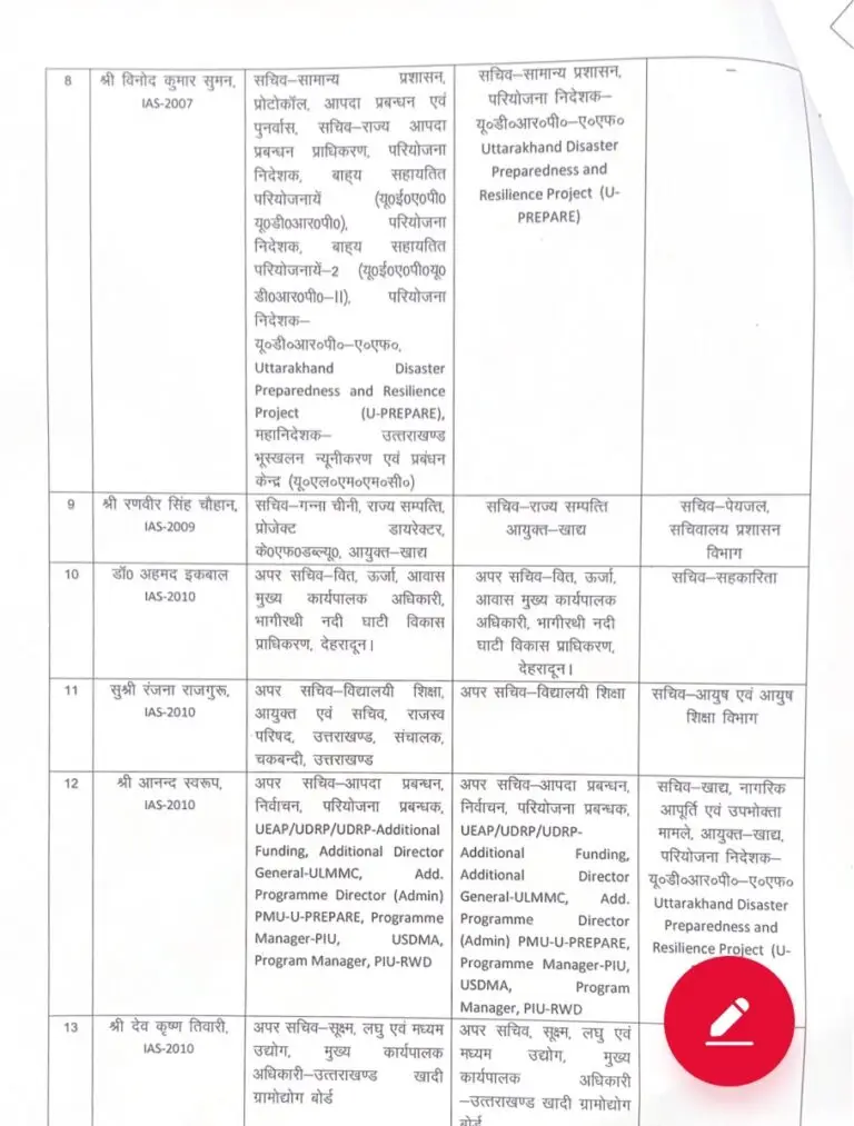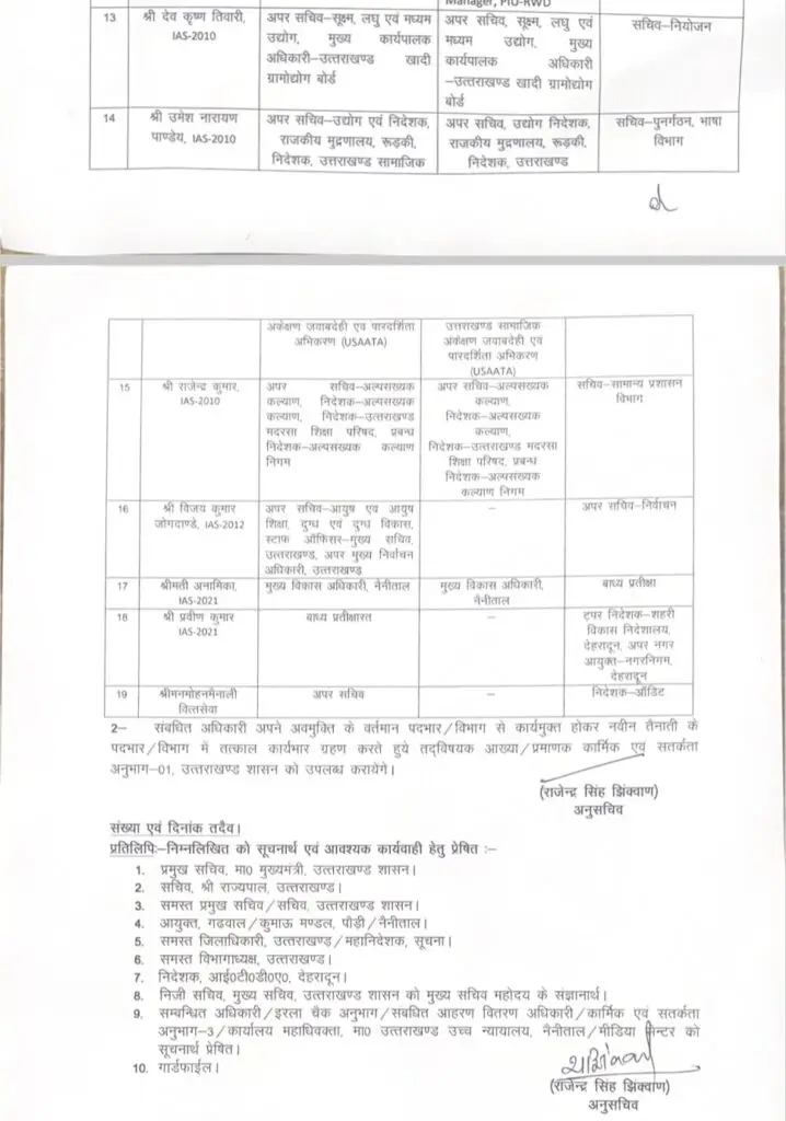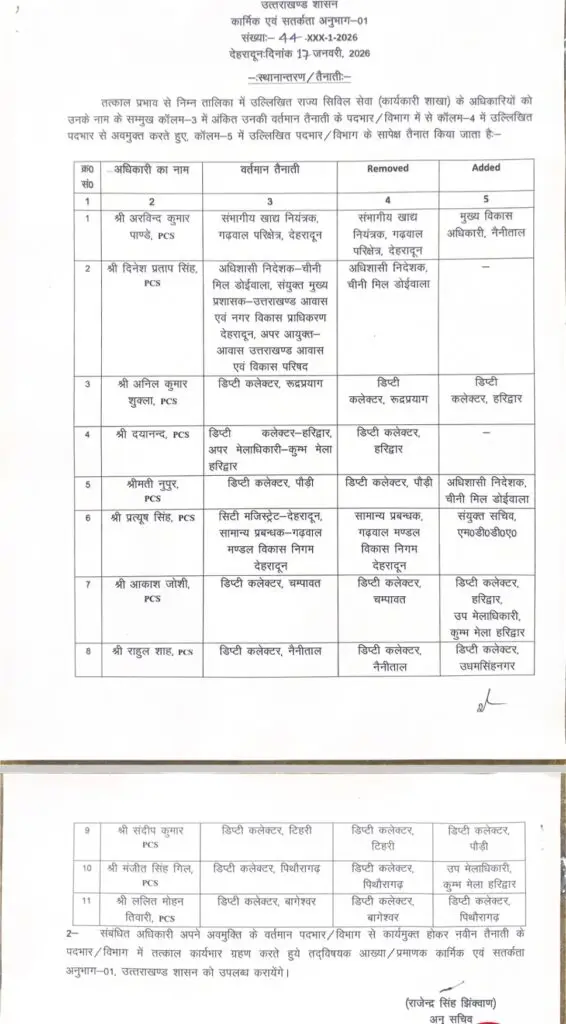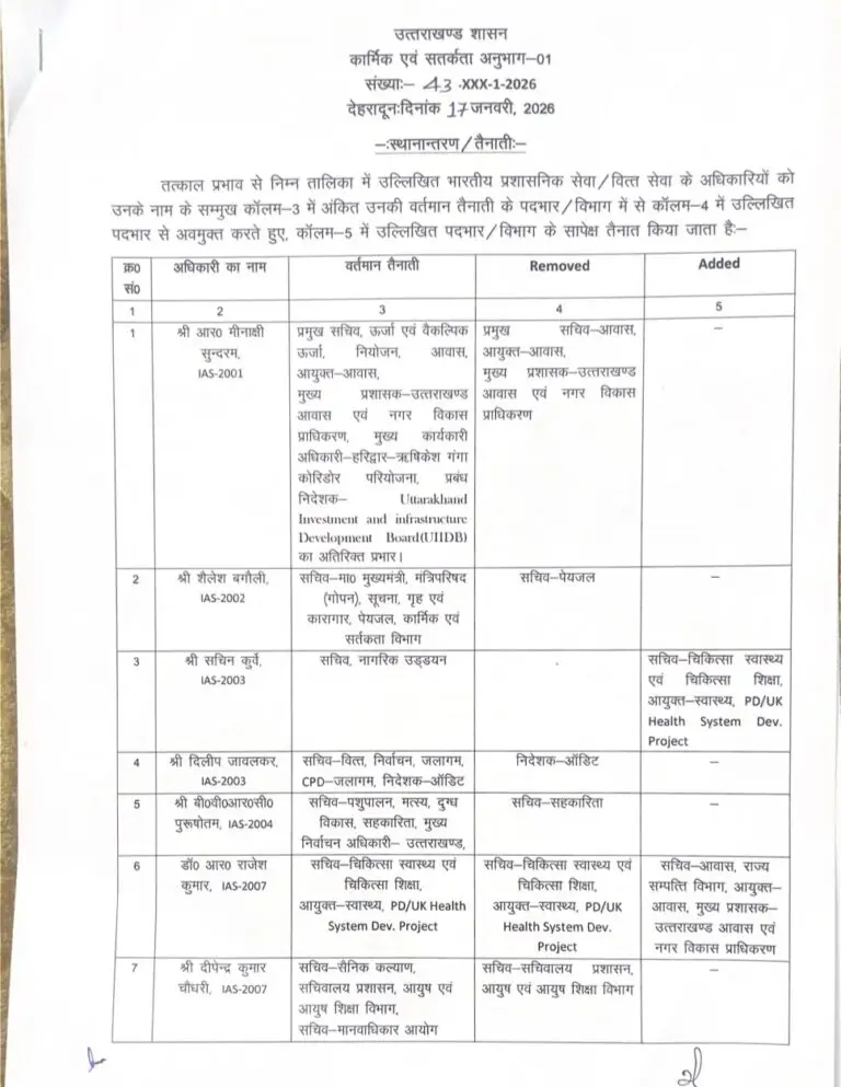 देहरादून :- उत्तराखंड शासन ने 19 आईएएस और 11 पीसीएस अफसरों के तबादले किए गए हैं। प्रमुख सचिव आर मीनाक्षी सुंदरम का बोझ हल्का करते हुए सरकार ने उनसे आवास, मुख्य प्रशासक आवास एवं नगर विकास प्राधिकरण की जिम्मेदारी हटा दी है। उन्हें कोई नया विभाग नहीं सौंपा गया। सचिव मुख्यमंत्री शैलेश बगौली से पेयजल हटाकर रणवीर चौहान को दिया गया है। सचिव रणवीर सिंह चौहान से राज्य संपत्ति व आयुक्त खाद्य की जिम्मेदारी हटाई गई है।