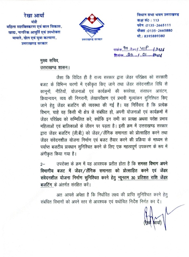 महिला सशक्तिकरण एवं बाल विकास मंत्री रेखा आर्या ने बताया कि प्रदेश में लगभग दो दशक से जेंडर बजटिंग की व्यवस्था लागू है, लेकिन शुरू में इसमें बजट का कम हिस्सा दिया जाता था। उन्होंने कहा कि भाजपा सरकार ने पिछले 5 साल में हर बार जेंडर बजट को बढ़ाया है। उन्होंने कहा कि प्रदेश की महिलाओं को सही अर्थों में सशक्त बनाने और आर्थिक-सामाजिक रूप से उनके हाथ मजबूत करने के लिए ज्यादा धन की आवश्यकता है। पत्र में उन्होंने लिखा है कि आगामी बजट में महिला केंद्रित योजनाओं के लिए 30% धन आरक्षित किया जाना चाहिए और हर विभाग में इस नीति का अनुपालन भी निश्चित किया जाए।