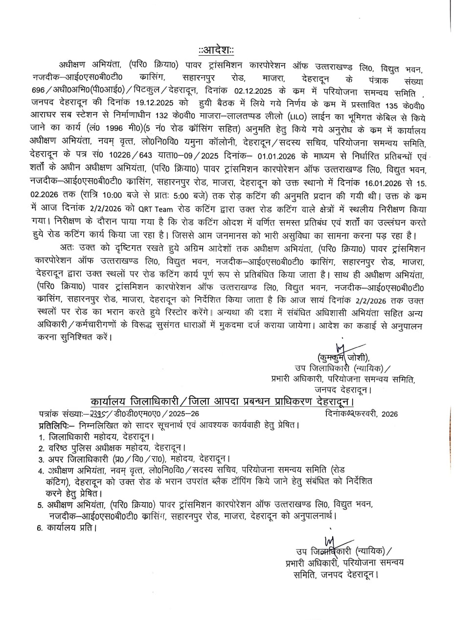 अधीक्षण अभियंता (परियोजना क्रियान्वयन), पावर ट्रांसमिशन कारपोरेशन ऑफ उत्तराखण्ड लिमिटेड (पिटकुल) द्वारा 135 के.वी. आराघर सब-स्टेशन से निर्माणाधीन 132 के.वी. माजरा-लालतप्पड़ एलआईएलओ लाइन को भूमिगत केबिल के माध्यम से बिछाने (कुल लंबाई 1996 मीटर, 5 रोड क्रॉसिंग सहित) हेतु रोड कटिंग की अनुमति का अनुरोध पर परियोजना समन्वय समिति, जनपद देहरादून ने 19.12.2025 को आयोजित बैठक में लिए गए निर्णय के क्रम में अधीक्षण अभियंता, नवम वृत्त, लोक निर्माण विभाग, यमुना कॉलोनी, देहरादून / सदस्य सचिव, परियोजना समन्वय समिति द्वारा पत्र 01.01.2026 के माध्यम से निर्धारित शर्तों एवं प्रतिबंधों के अधीन 16.01.2026 से 15.02.2026 तक, रात्रि 10 बजे से प्रातः 5 बजे तक रोड कटिंग की सशर्त अनुमति प्रदान की गई थी।