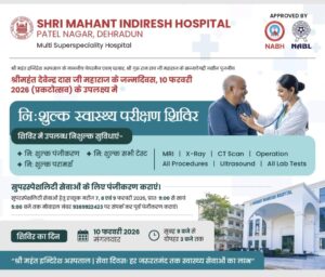 देहरादून :- दरबार श्री गुरु राम राय जी महाराज के सज्जादे गद्दी नशीन एवं पूजनीय श्रीमहंत देवेन्द्र दास जी महाराज के जन्मदिवस (प्रकटोत्सव 10 फरवरी) के पावन अवसर पर श्री महंत इन्दिरेश अस्पताल, देहरादून द्वारा 10 फरवरी 2026 (मंगलवार) को एक विशाल निःशुल्क स्वास्थ्य परीक्षण शिविर का आयोजन किया जा रहा है, जिसे इस वर्ष सेवा दिवस के रूप में श्रद्धा, सेवा और समर्पण की भावना के साथ मनाया जाएगा। इस शिविर में जनरल चिकित्सा सेवाओं के साथ-साथ सभी सुपरस्पेशलिटी सेवाएं भी पूर्णतः निःशुल्क उपलब्ध कराई जाएंगी। शिविर के लिए पंजीकरण सुबह 08 बजे से प्रारंभ होगा, जबकि मरीज सुबह 09 बजे से दोपहर 03 बजे तक स्वास्थ्य सेवाओं का लाभ ले सकेंगे।