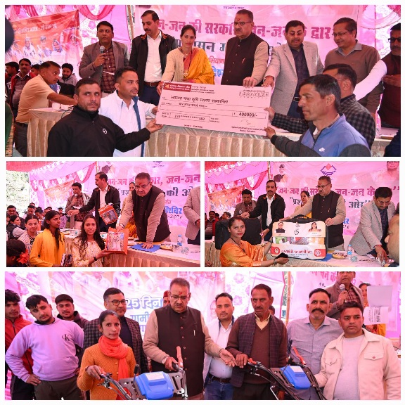 शिविर में कृषि विभाग के माध्यम से ज्वालपा माता स्वयं सहायता समूह को फार्म मशीनरी बैंक की खरीद हेतु 4 लाख रुपये का अनुदान चेक प्रदान किया गया। साथ ही किसान महेन्द्र तथा मंजू देवी को 80 प्रतिशत अनुदान पर पावर वीडर वितरित किए गए। बाल विकास विभाग द्वारा 02 महिलाओं को मुख्यमंत्री महालक्ष्मी किट तथा 10 लाभार्थियों को किशोरी किट प्रदान की गई। शिविर के दौरान 17 व्यक्तियों के आधार कार्ड का अद्यतन (अपडेशन) किया गया तथा एक दिव्यांग प्रमाण पत्र भी मौके पर ही निर्गत किया गया।