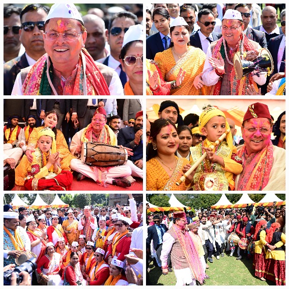 मुख्यमंत्री आवास का प्रांगण सोमवार को होली के रंगों में सराबोर नजर आया। इस दौरान प्रदेश की सांस्कृतिक समृद्धि और एकता के भी दर्शन हुए। पूर्वाह्न से ही प्रदेश भर के लोक कलाकारों, संस्कृति कर्मियों की टोलियां होली गायन करते हुए, सीएम आवास पहुंचती रही। एक तरफ गढ़वाल-कुमाऊं से लेकर जौनसार तक का होली गायन था, नृत्य था। इस दौरान होली के गीत गूंजे। पारंपरिक गायन हुआ। ढोल, मंजीरे बजे। पारंपरिक वाद्य यंत्रों की संगत ने होली गीतों के प्रभाव को और बढ़ा दिया। आओ दगड़ियो, नाचा गावा, आ गई रंगीली होली का आह्वान यदि कुमांउ से आए कलाकारों ने किया, तो राठ क्षेत्र के कलाकारों ने गाया-आई डान्ड्यू बसंत, डाली मा मौल्यार।