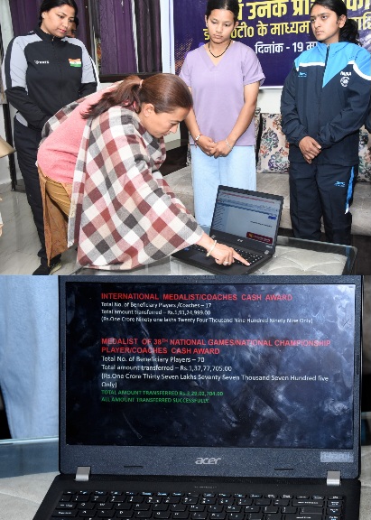 देहरादून :-विभिन्न राष्ट्रीय एवं अंतरराष्ट्रीय खेल स्पर्धाओं में पदक जीतने वाले प्रदेश के खिलाड़ियों और प्रशिक्षकों को 3 करोड़ से ज्यादा की इनामी धन राशि जारी की गई है। बृहस्पतिवार को यमुना कॉलोनी स्थित कैंप कार्यालय में खेल मंत्री रेखा आर्या ने यह धनराशि खिलाड़ियों के खातों में डीबीटी ट्रांसफर की।