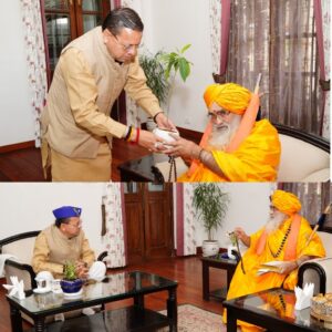 देहरादून :- मुख्यमंत्री पुष्कर सिंह धामी से गुरुवार को श्री केदारनाथ धाम के रावल श्री श्री श्री 1008 भीमाशंकर लिंग ने शिष्टाचार भेंट की तथा उन्हें आशीर्वाद प्रदान किया। इस अवसर पर रावल ने भगवान केदारनाथ जी की कृपा एवं प्रदेश की सुख-समृद्धि की कामना की।
