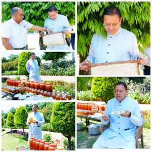 देहरादून :- मुख्यमंत्री पुष्कर सिंह धामी ने शनिवार को मुख्यमंत्री आवास परिसर में शहद निकालने की प्रक्रिया का अवलोकन किया। मुख्यमंत्री आवास परिसर में इस वर्ष मात्र 45 दिनों की अवधि में 520 किलोग्राम शहद का उत्पादन किया गया।