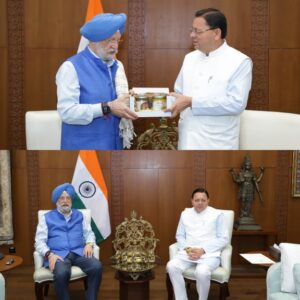 देहरादून :- मुख्यमंत्री पुष्कर सिंह धामी ने केंद्रीय पेट्रोलियम एवं प्राकृतिक गैस मंत्री हरदीप सिंह पुरी से नई दिल्ली स्थित कर्तव्य भवन में भेंट कर उत्तराखण्ड की भौगोलिक परिस्थितियों एवं आपदाजन्य संवेदनशीलता के दृष्टिगत विभिन्न महत्वपूर्ण विषयों पर विस्तृत चर्चा की।